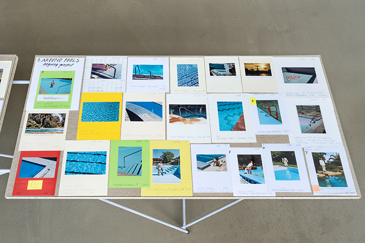Schon in den frühen Jahren seiner künstlerischen Tätigkeit definierte Leitner Themen, Motive und Kategorien, mittels derer er seine eingangs erwähnte »Außendiensttätigkeit« vorbereitet, aber auch bestrebt ist, im »Innendienst« sein viele tausend Fotografien umfassendes Archiv anhand dieser zu ordnen. Die im Ausstellungsraum von Camera Austria auf Tischen angeordneten, sorgfältig auf Tonkarton geklebten und mit der jeweiligen Filmrollen- und Bildnummer beschrifteten Arbeitsprints bieten einen kleinen Einblick in dieses Archiv. Sie machen aber auch deutlich, dass Leitners Unterfangen, das eigene Œuvre Typologien zu unterwerfen und eine Ordnung zu schaffen ebenso wie seine fotografischen Wanderungen immer wieder auf Ab- und Umwege führt, nachdem sich viele der in den Blick genommenen Motive (Street Life / Architecture / Signs & Advertisements; Hotel Rooms / Pools / Self-Portrait; Botanik) durchaus mehreren Kategorien zuordnen lassen und alle seiner Aufnahmen einem durch und durch subjektiv geprägten Blick folgen. In diesem Sinne wird das Archiv in gewisser Weise ad absurdum geführt, denn es geht Paul Albert Leitner trotz der gewissenhaften Zuordnung und durchaus möglichen Zuordenbarkeit seiner Bilder am Ende nicht um ein vergleichendes Sehen, wie es die wohl berühmtesten Vertreter*innen typologischer Fotografie, Bernd und Hilla Becher, verfolgten, sondern – womöglich nicht unähnlich zum Blättern in den »tausenden Seiten« der Stadt – um ein Immer-Wieder-Zurückkehren zum Material, um ein Entdecken und Wiederentdecken der Bilder und damit auch um eine Auseinandersetzung mit dem Selbst.