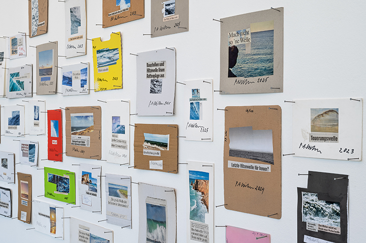 Das Sammeln, Sezieren, lustvolle Interpretieren und Kontextualisieren der Gegenwart wird nicht zuletzt in dem 2020 begonnenen Langzeitprojekt Die Wellen kommen deutlich. Aus Zeitungen und Zeitschriften ausgeschnittene Bilder von Meereswellen, Strandansichten, Nahaufnahmen überschäumender Gischt treffen hier auf sorgfältig aus diesen oder auch anderen Zeitungen ausgeschnittene Schlagzeilen, die politische, wirtschaftliche und gesellschaftliche Entwicklungen thematisieren: »Abschiebungswelle«, »Beispiellose Pleitewelle im Handel«, »Datenschutz: Kommt Klagewelle auf Firmen zu«, »Faulheitswelle am Arbeitsmarkt?«. War das Thema zu Beginn der Serie mit der Entwicklung der Covid-19-Pandemie konnotiert (»Herbstwelle nimmt Fahrt auf, Tests nicht gratis«), versammelt Leitner hier ein ganzes Archiv von Wellenbewegungen, die die Verfasstheit der Welt seit 2020 dokumentieren und als assoziatives Zeitdokument gelesen werden können.