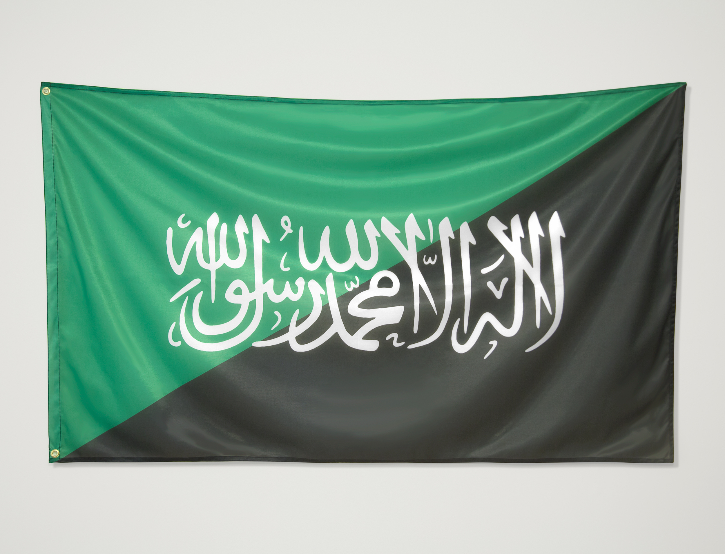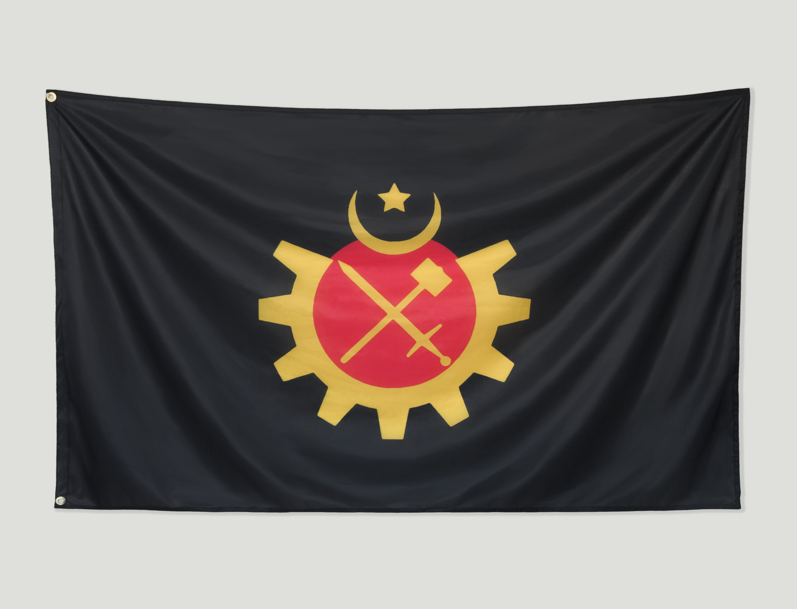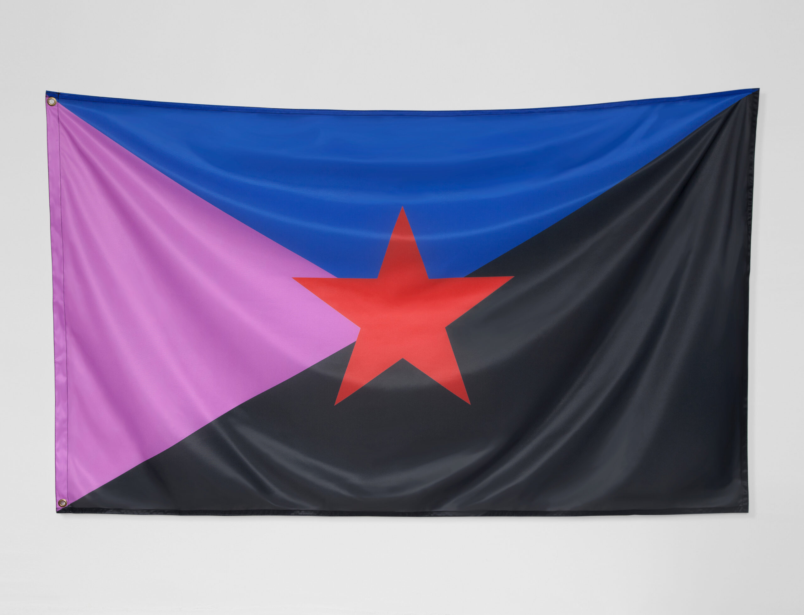 While Braga probes the ritualized dynamics of postdigital work, Joshua Citarella focuses on the ideological gestures of self-localization within platform-based public spheres. His series e-deologies (2020–25) compiles flags found online, usually designed by teenagers and melding different political ideologies. Here, for example, we might encounter peculiar and quite contradictory combinations such as “anarcho-primitivist caliphate,” which links the rejection of modern civilization (anarcho-primitivism) with the authoritarian power structure of a system of rule legitimized by Islam (caliphate). These flags are often produced inexpensively using print-on-demand services and then hung on the walls of the rooms of children and teenagers—similar to the way the two previous generations, namely, Generation X and Millennials, hung up posters of their favorite bands. Such hyperspecific categories enable Gen Z to position themselves within an increasingly chaotic online political landscape.